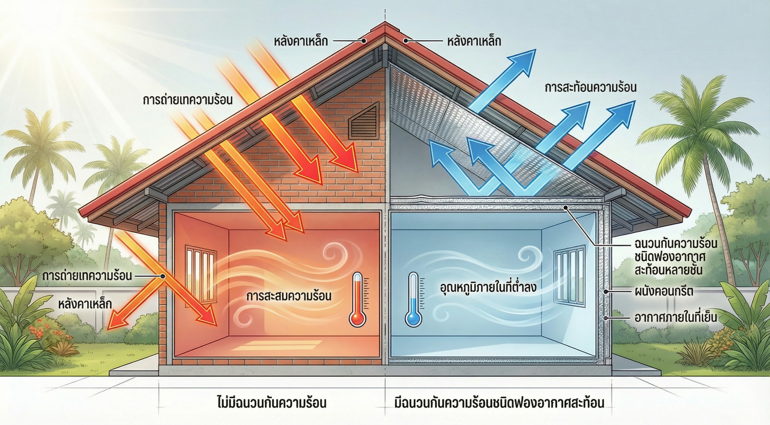 ประเทศไทยเป็นเมืองร้อนที่มีอุณหภูมิสูงตลอดทั้งปี แสงแดดที่รุนแรงแผ่รังสีความร้อนลงบนหลังคาโดยตรงเป็นเวลานานหลายชั่วโมงต่อวัน ซึ่งความร้อนส่วนใหญ่เข้าสู่ตัวบ้านผ่านจุดสำคัญดังนี้: